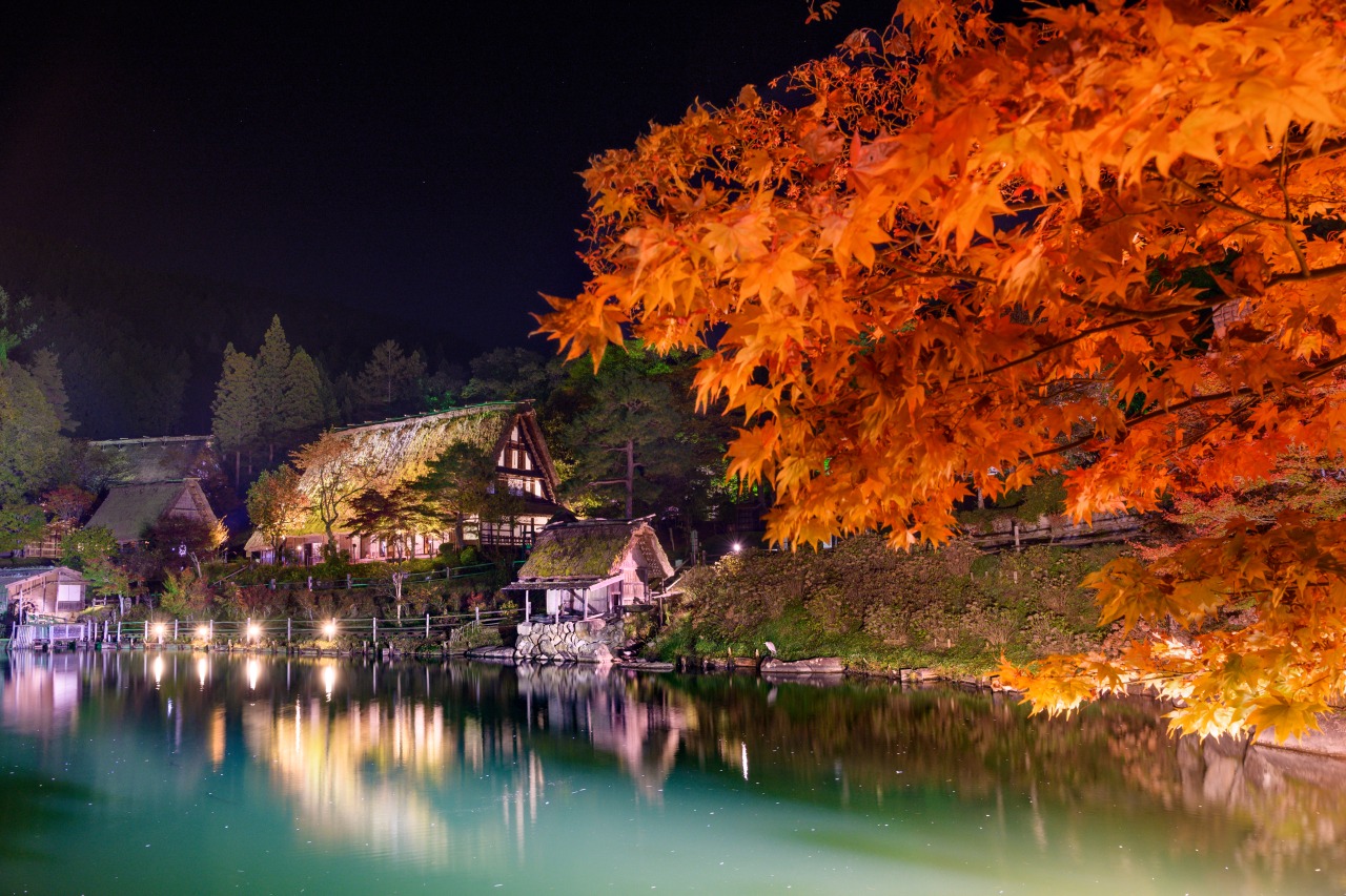 在飛驒之里,保存著古老的合掌造建築與飛驒民家。入秋後,層層紅葉將山村染成溫暖的色調。而當夜幕降臨,點燈點亮了屋舍與樹影,光與影交錯之間,時間彷彿放慢了腳步。