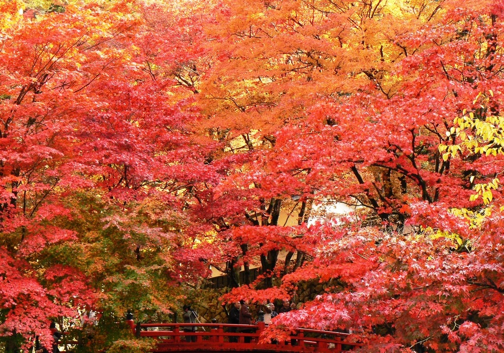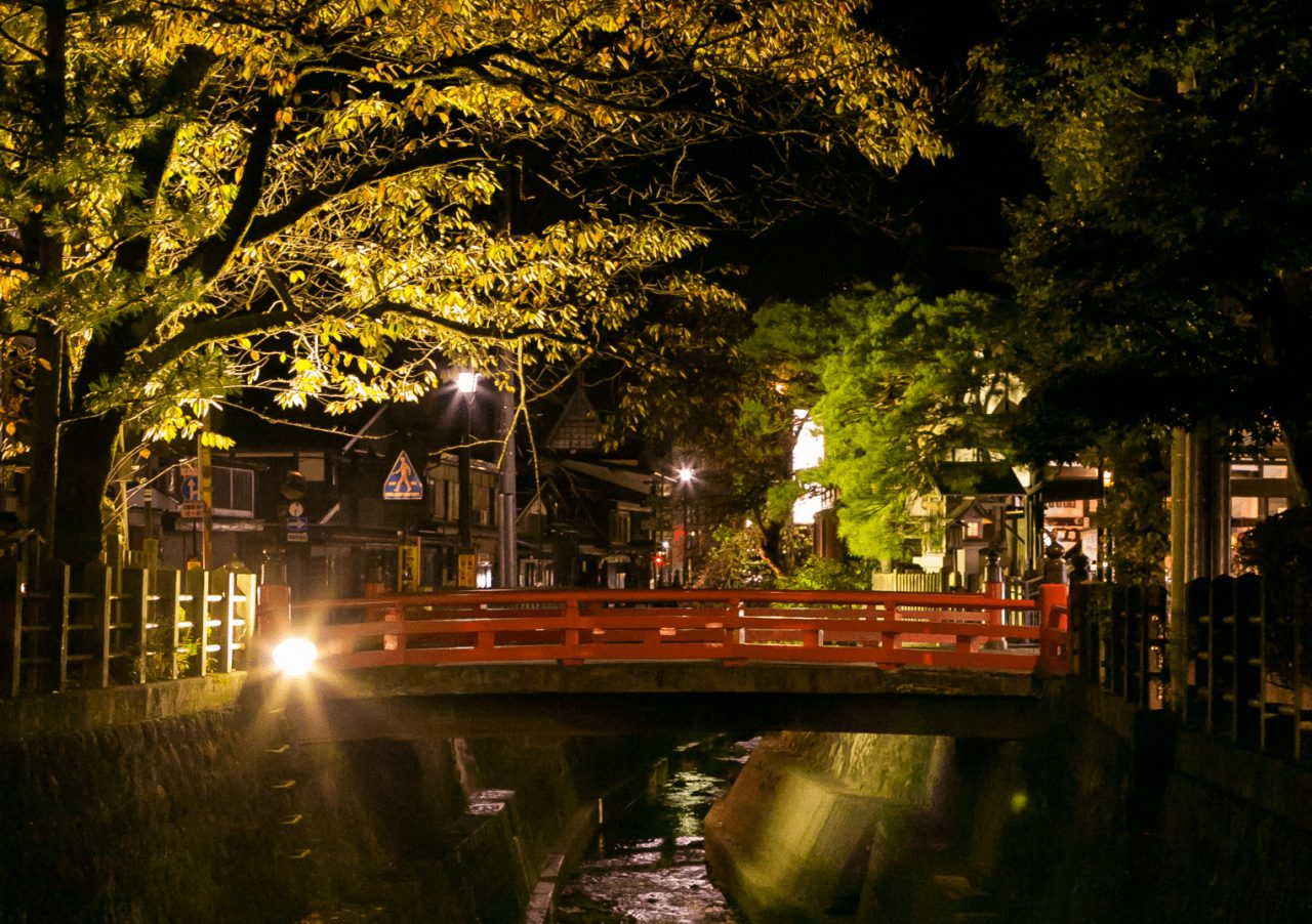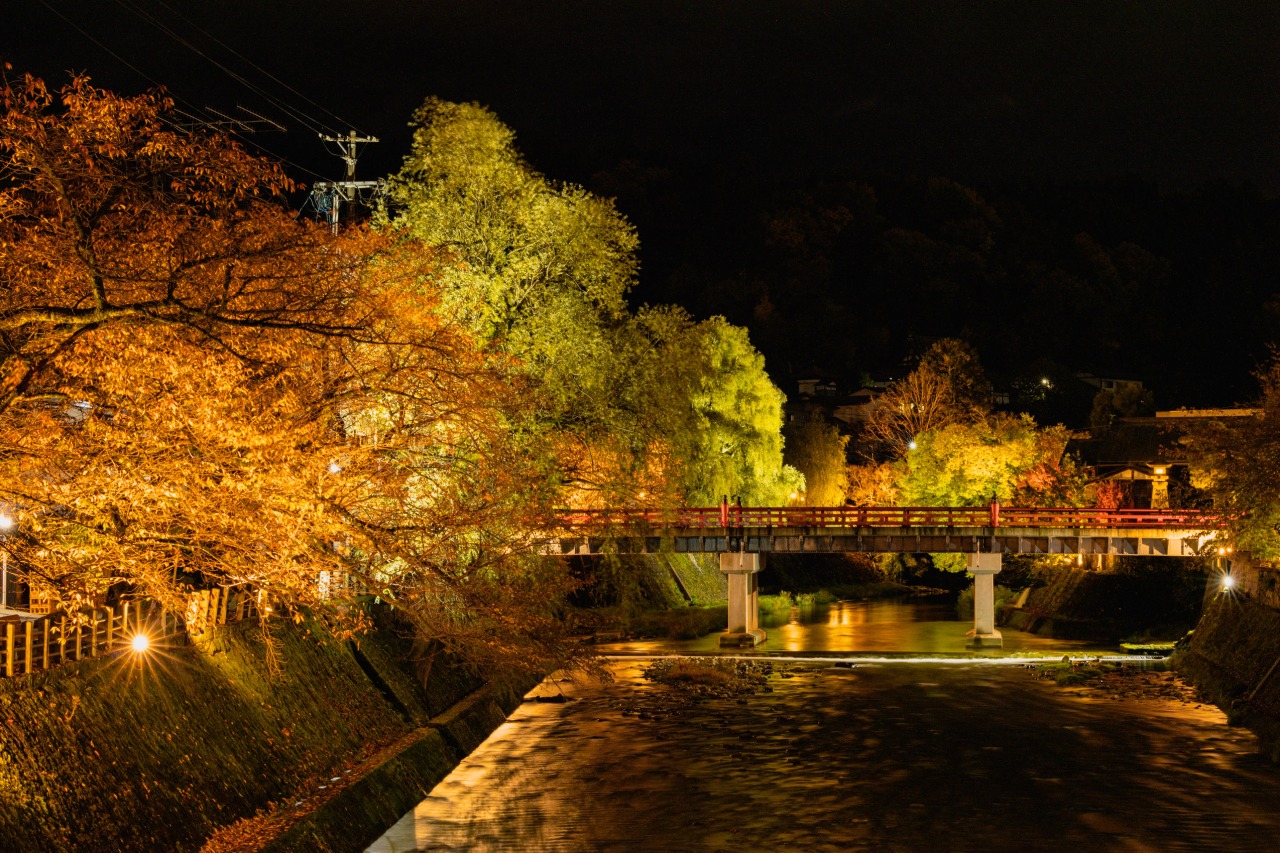 高山市的象徵「中橋」每年秋天都會舉辦夜間點燈活動。當橋身與楓葉一同被燈光照亮,映照在宮川河面上,整個景色如詩如畫,是高山最具代表性的紅葉拍照熱點。
